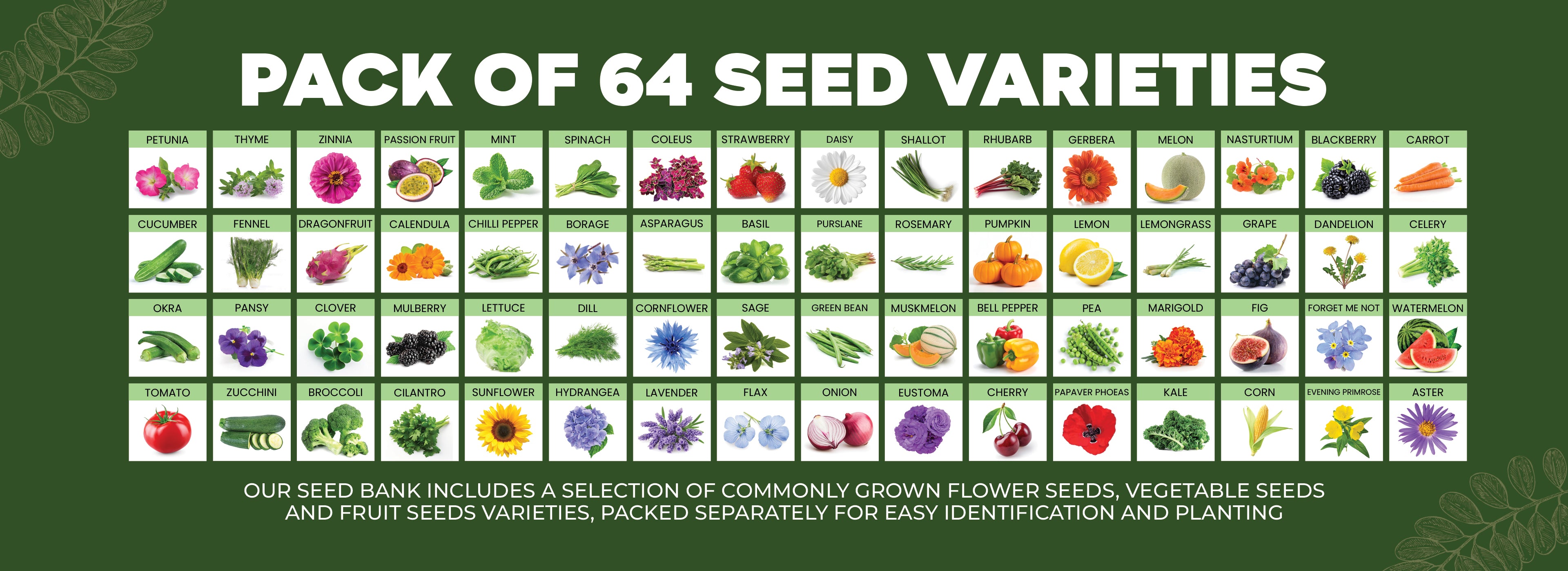 Banco de Semillas Todo en Uno para Jardín – 64 Variedades de Semillas (Flores, Hierbas, Verduras, Frutas) | organicindiaseeds Banco de Semillas Todo en Uno para Jardín – 64 Variedades de Semillas Ir al contenido